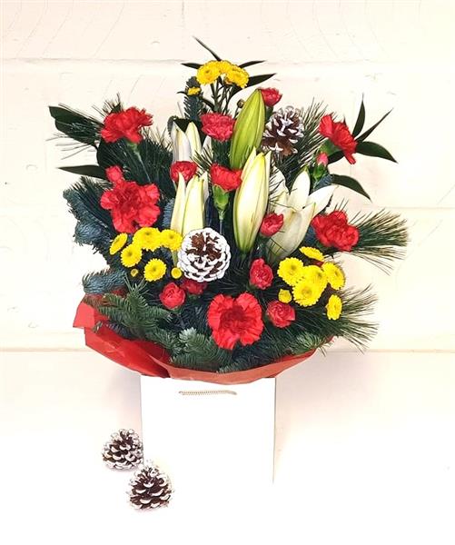 The floral arrangement features Seasonal winter flowers in festive reds, yellows and whites with Pine Cones and blue spruce arranged into a Winter Gift bag delivered in Canvey Island, Benfleet or Free Click & Collect from Plantwise Florists Shop in Canvey.