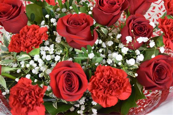 • Features Luxury Large Red Roses, Red Carnations & Gyp with greenery hand-tied and delivered in a water bubble with romantic gift wrapping delivered in a red gift bag for instant display.
