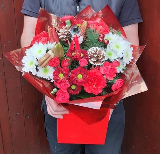 Packed full of seasonal Red and White Christmas Flowers handpicked by us with Cinnamon Bundles, Pine Cone and a Festive Christmas Robin Pick hand-tied and finished with Christmas gift wrapping delivered in a water bubble and placed into a gift bag ready to enjoy. A really special Christmas luxury bouquet they will love.