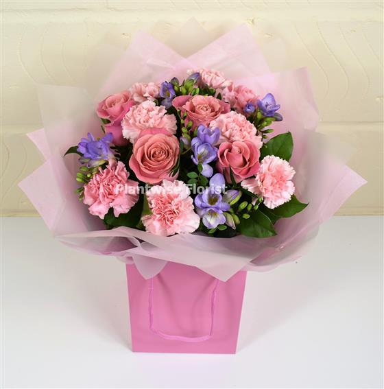 A very special Mother's day bouquet of Lilac Freesia with Stunning large headed Pink Roses with delicate carnations and mixed greenery, hand-tied finished with pretty pink gift wrapping and delivered in water ready for your Mum or Nan to enjoy on Mother's day guaranteed to be very popular this mother's day.