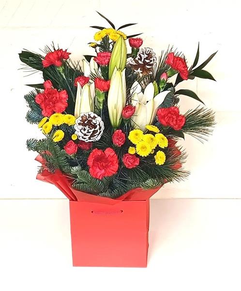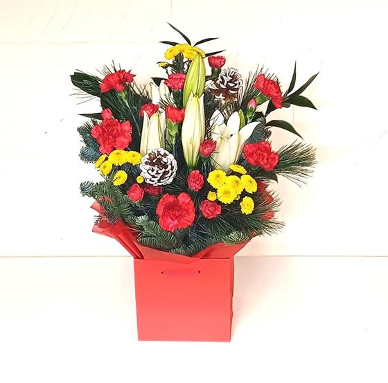 We will arrange Festive Christmas Flowers with Pine Cones and Blue Spruce arranged in oasis placed in a Christmas gift bag which is sure to brighten their day. Order for Christmas flowers delivery in Canvey Island, Benfleet in Essex Or Free Click & Collect in-store.