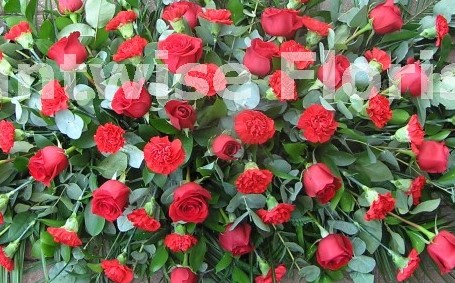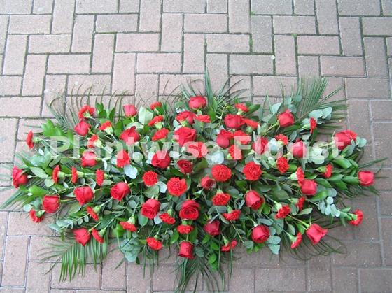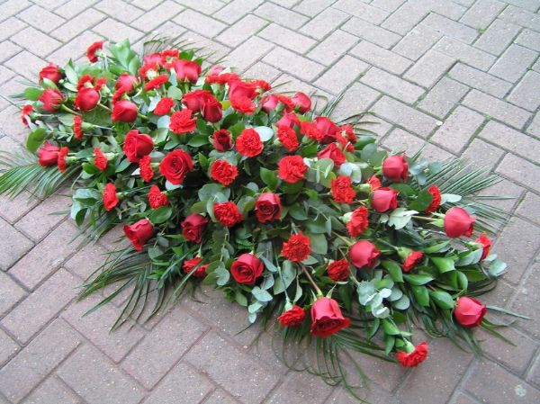 This beautiful all Red Casket Spray is designed to be placed on top of the coffin and features the Finest Large Headed Red Roses and Red Carnations and complimented with Choice Foliage's. It is available in three sizes however the most popular size is 5'.