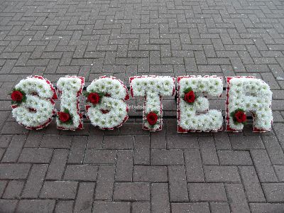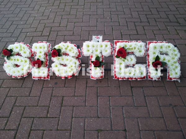 Each letter is based in Double Chrysanths and a Single Rose is arranged onto each letter. Finished with a matching ribbon edge.