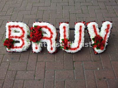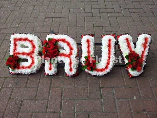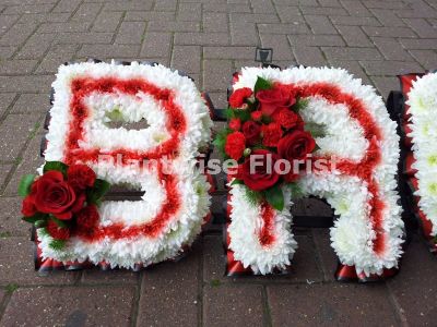 Each letter is based in Double Chrysanths and a Coloured Stripe is sprayed onto each letter and a full Cluster of Roses, Spray Carnations and Choice Foliage is arranged onto each letter. Finished with a matching ribbon edge.