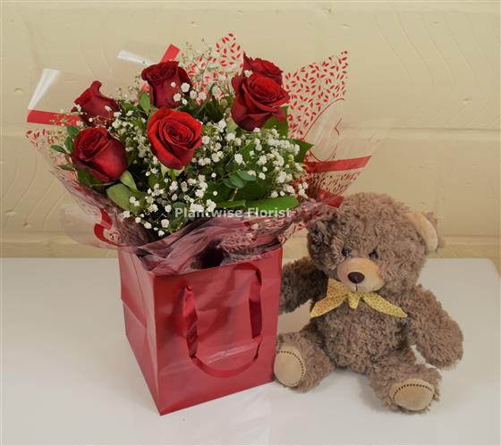 A Romantic Valentine Gift Set of a bouquet of 6 Red Roses with a Teddy Bear by Plantwise Florist who have carefully hand-tied 6 Valentine's Best Red Roses with gypsophila and greenery, finished with Valentine gift wrapping and ribbon with a cute Teddy Included In The Price.