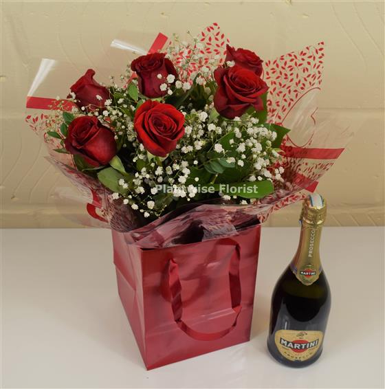 The 6 Red Roses are big and beautiful, carefully hand-tied with gypsophila and greenery with Valentines gift wrapping, aqua packed in water with a bottle of Prosecco that you can share together over dinner on Valentine's day.