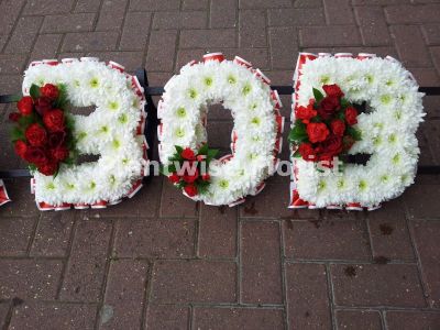 The Floral Letters Tribute Wreath is made using Double Chrysanthemums with a full cluster of Roses, Spray Carnations and greenery on each letter, finished with a ribbon edge.