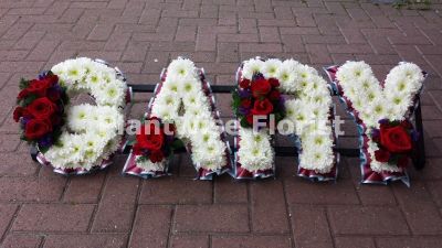 The Floral Letters Tribute Wreath is made using Double Chrysanthemums with a full cluster of Roses, Spray Carnations and greenery on each letter, finished with a ribbon edge. If blue flowers are required then roses will be replaced with a different blue flower.