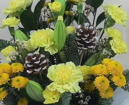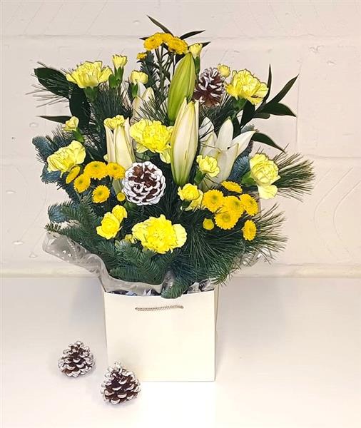 Imagine the bright winter sun on a frosty winters morning and that sums up our seasonal winter flowers in warm yellows and cool whites with blue spruce and pine cones which Plantwise Florist have carefully arranged in a gift box ready for you to enjoy as soon as they are delivered.