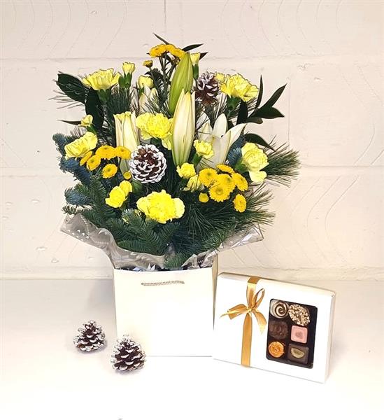 Our Gift Set features our Seasonal gift box arrangement of seasonal Winter flowers in warm bright yellows and cool whites with a box of delicious chocolates included in price.