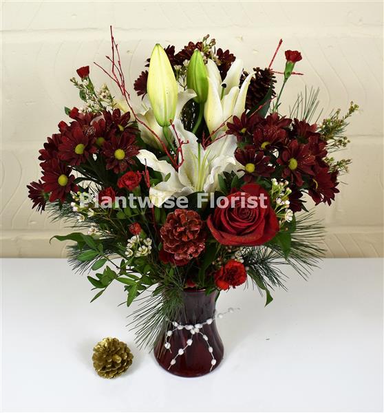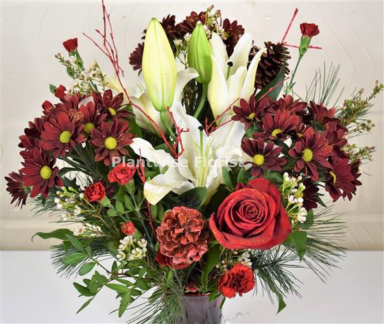 Please note These Christmas Flowers are hand made by Plantwise Florist in Canvey Island so can be ordered for Christmas flower delivery in SS8 Canvey Island, SS7 Benfleet, South Benfleet, Thundersley, New Thundersley, Daws Heath, Hadleigh, SS13 Pitsea or Bowers Gifford in Essex or can be collected in store free of charge on any day you wish before Christmas. All deliveries are done by our own drivers at Plantwise Florist . It is essential you include a phone number for the delivery address we are delivering to in case someone does not answer the door. We DO NOT Call before we get to the address we only call if we have no answer at the delivery address.