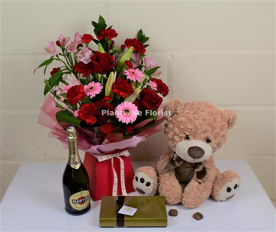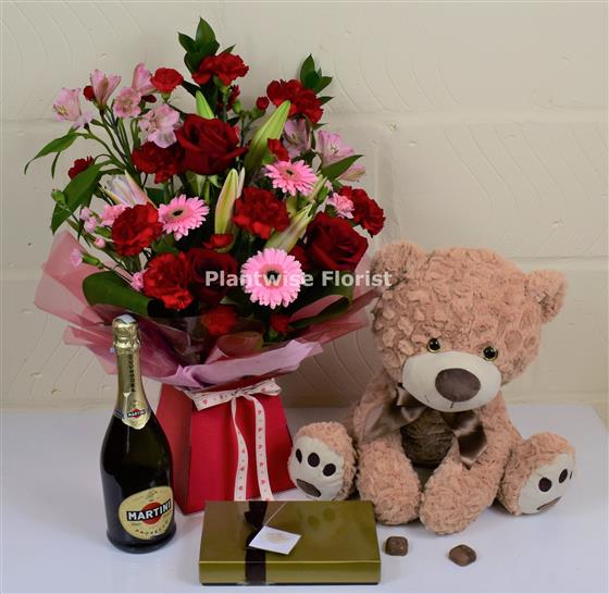 If you are looking to buy a really special Valentine's day present then order our Love Hearts Gift Box filled with romantic red and pink valentines day flowers which also includes a bottle of our finest Prosecco, a Large Teddy bear and a box of Chocolates which you can share together on Valentine's day.