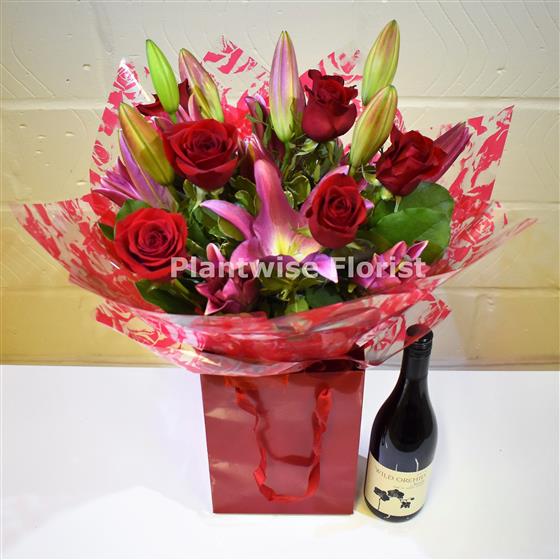 Plantwise Florist have created this Valentine bouquet as the flowers smell amazing, features our best red roses and you can share the wine together on Valentine's day.