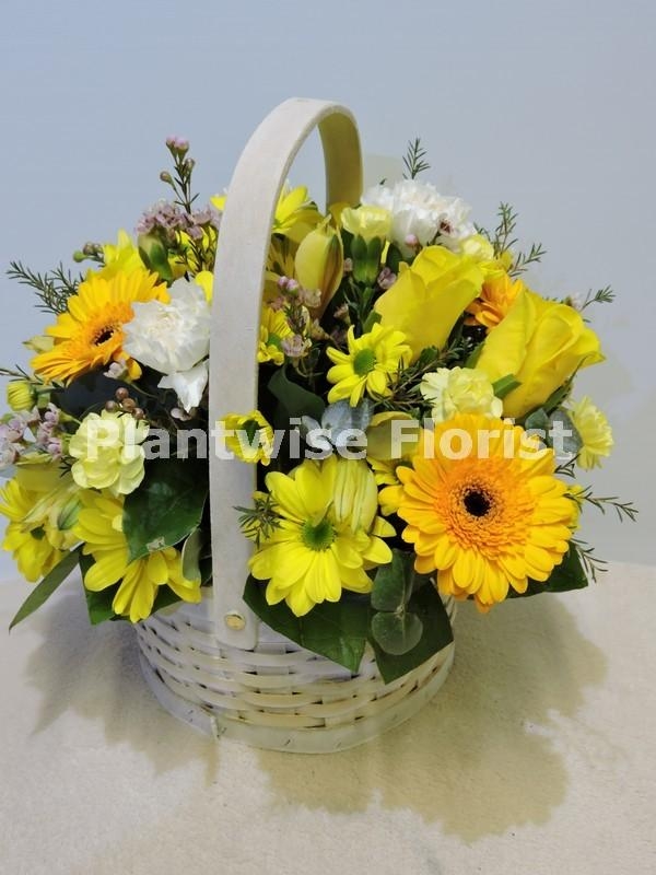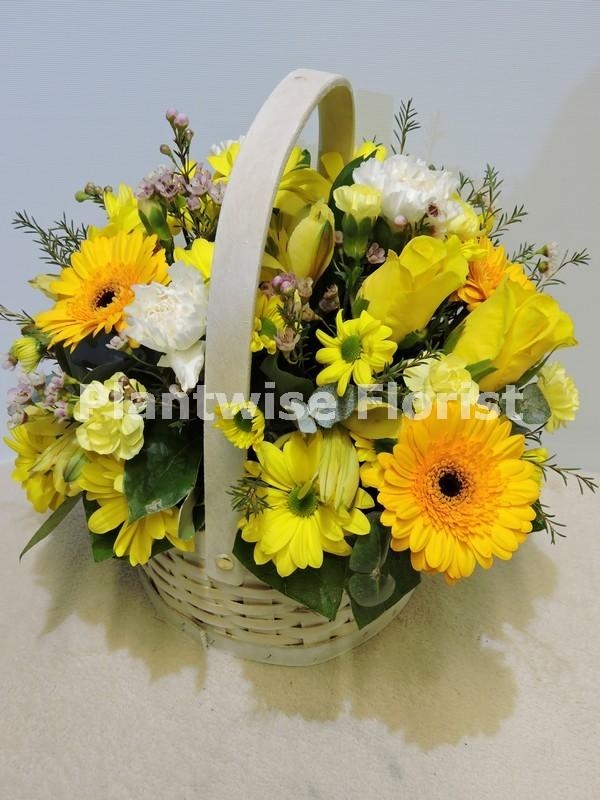 Let Plantwise Florist brighten their day by sending this beautiful spring flower arrangement. We have made this flower arrangement by using roses, germini, chrysanthemum, waxflowers, carnations, alstromeria, spray carnations in bright yellow and white flowers with mixed greenery arranged into a charming white basket.