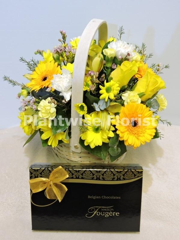 Our basket of spring flowers and chocolates gift set is a great gift to buy for any occasion. Plantwise Florist have chosen a selection of bright yellows flowers and arranged them into a wooden basket with a box of chocolates included in the price, They'll be delighted with your gift.