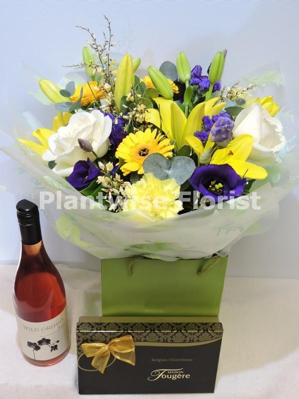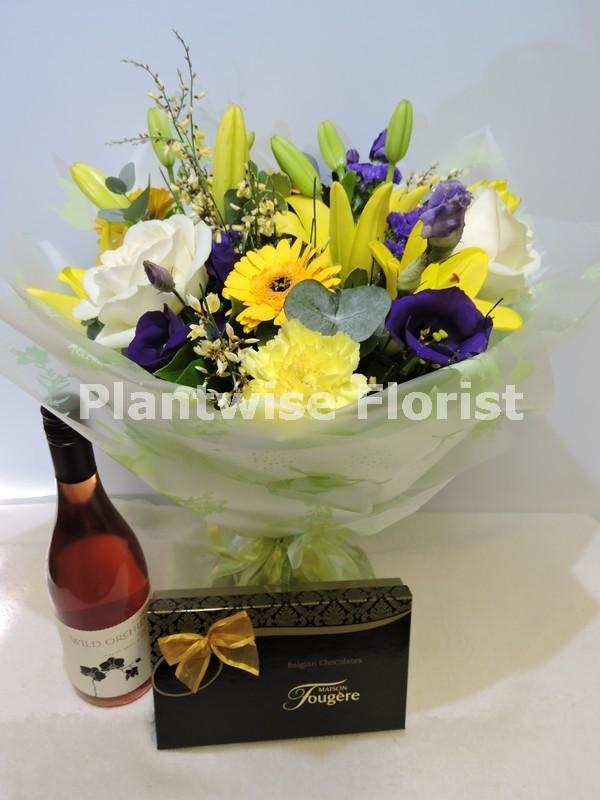 Plantwise Florist can deliver these extra special spring flowers bouquet with wine and chocolates gift set order for Same Day delivery in SS8 Canvey Island, SS7 Benfleet, Thundersley, Hadleigh, SS13 Pitsea Basildon or Collected in-store at Plantwise Florist.