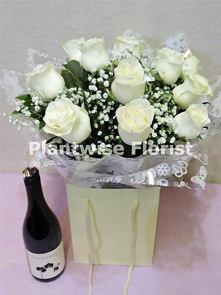Order your Valentine's Day Delivery of 12 White Roses Bouquet with Red Wine for Same day delivery on Valentines day to Canvey Island, Benfleet, Thundersley, Hadleigh, Pitsea, Basildon, Bowers Gifford in Essex on Valentines Day or can be collected in-store at Plantwise Florist in Canvey Island.