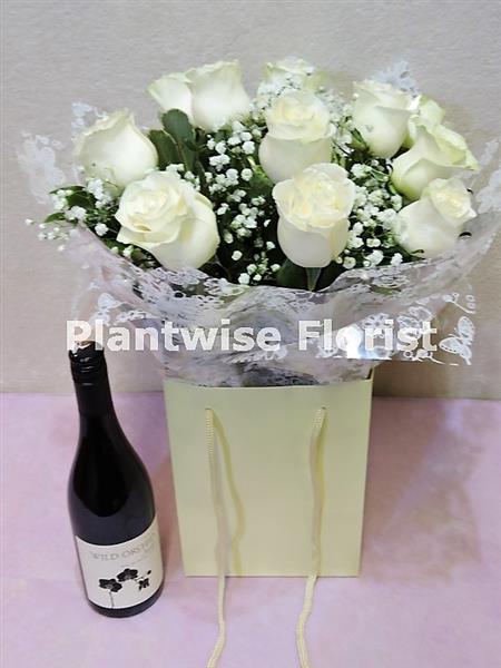 Plantwise Florist Extra Special Valentine Day Gift Set includes our incredible White Roses Bouquet with a bottle of our finest Red Wine a very special Valentines day present to buy for your Wife, Partner, Girlfriend on Valentine's day.