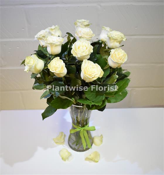 Let Plantwise Florist really impress the one you love on Valentines day with our luxury long stemmed White Roses which we have arranged for you into the Glass Vase with lush greenery.