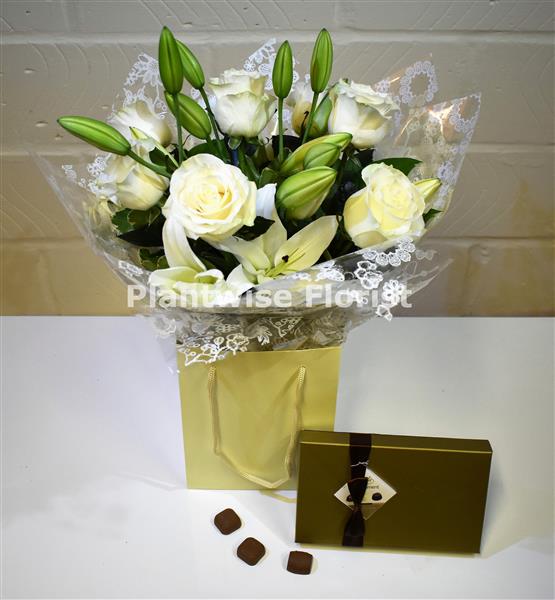 Spoil someone by ordering our fantastic gift set of a box of delicious Chocolates and a gorgeous bouquet of stunning white roses and white lilies.
