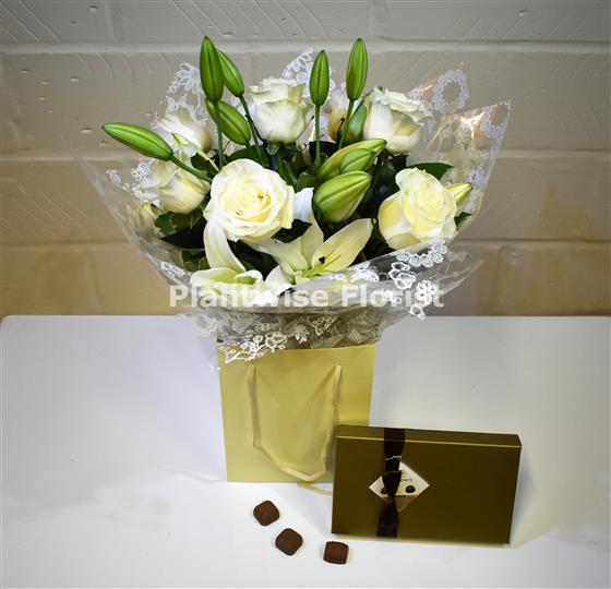 The hand-tied features huge white roses and lilies with mixed greenery delivered in a water bubble and stylish white gift bag with a box of delicious chocolates to enjoy.