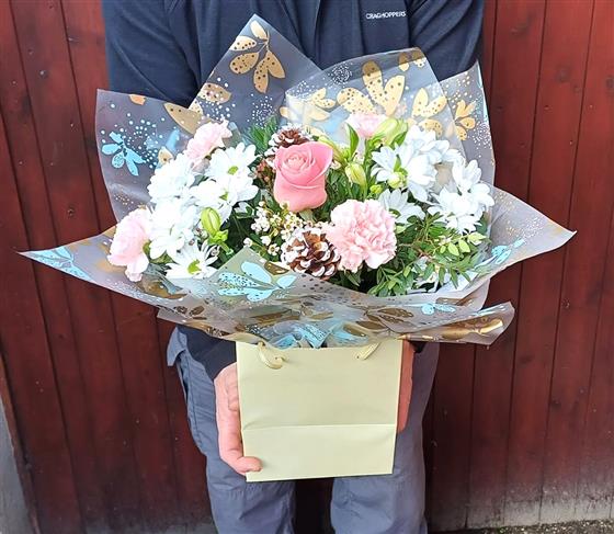 The Flowers are Hand-tied and delivered in water presented in a white gift box featuring Pine Cone, Rose, Carnations, Alstromeria, Wax flowers, Chrysanthemum and Seasonal Greenery with a sprinkling of silver glitter makes this a delightful bouquet of flowers to buy.