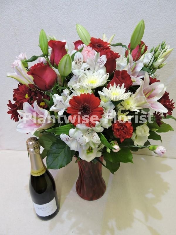 Plantwise Florist extra special gift set of our large vase full of beautiful Romantic flowers in Red, Pink and White with a bottle of Prosecco included in the price is a great way to show someone how much you love them.