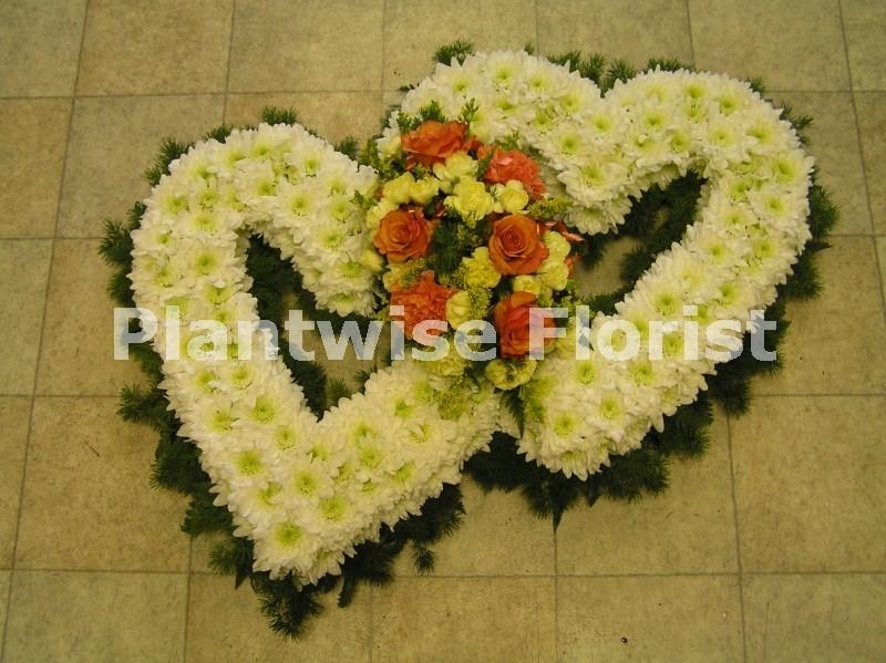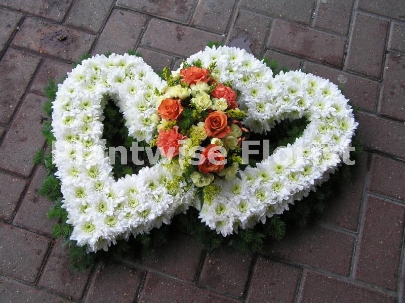 The double open heart wreath is based in White Double Chrysanths with a cluster of Roses, Spray Carnations and choice Foliage and the hearts are finished with a foliage edge.