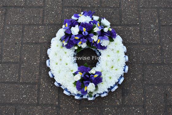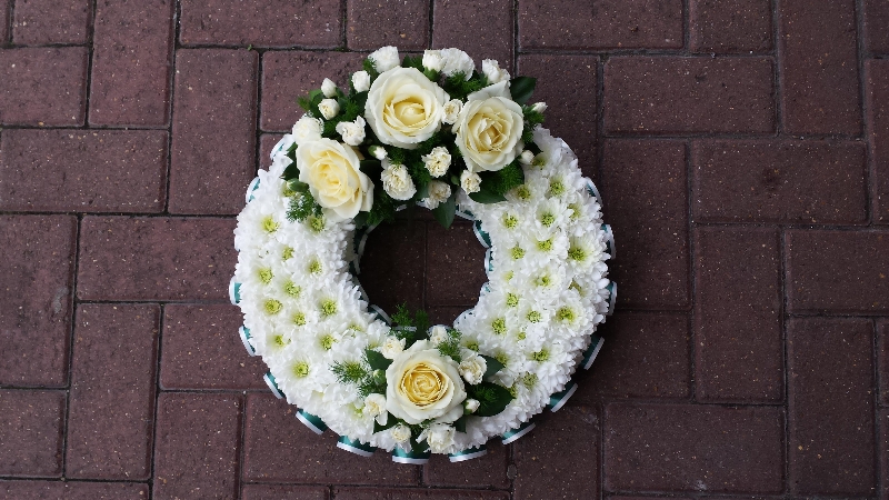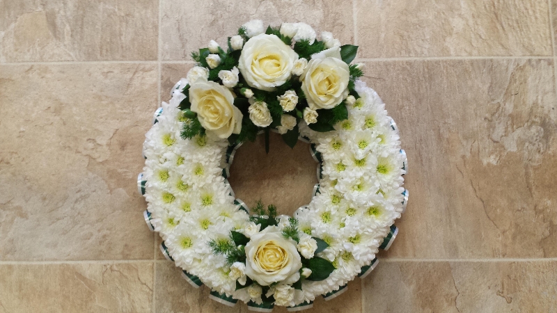 This traditional based circular funeral wreath is based in White Double Chrysanths with two clusters of Roses, Spray Carnations and choice foliage's finished with a matching ribbon edge.