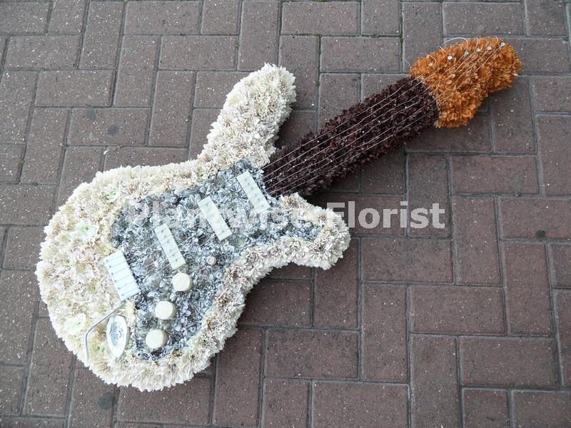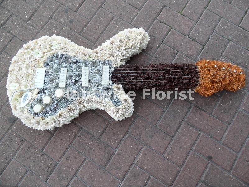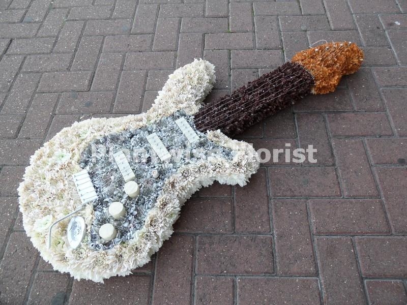 Plantwise Florist in Canvey Island have made this unusual funeral wreath of Stratocaster Guitar Wreath which has been made in flowers in creams and mother of pearl colours.
