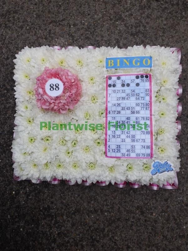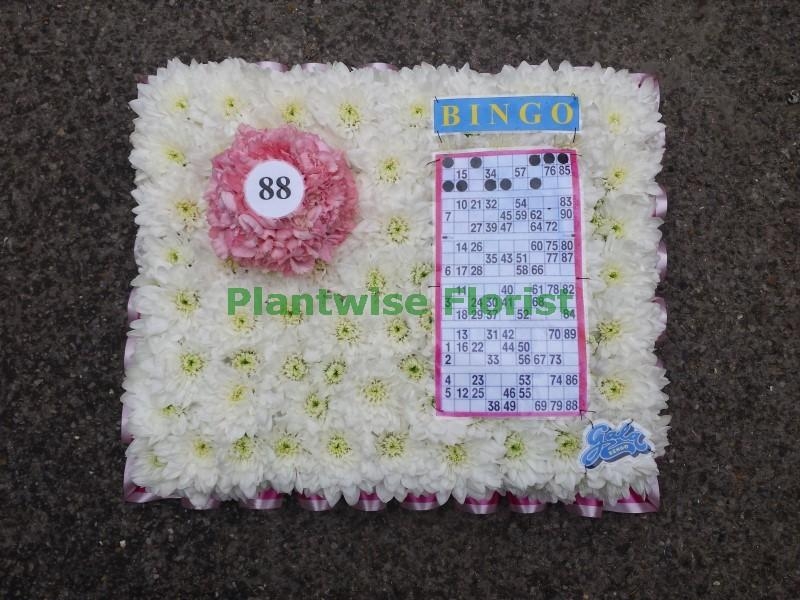Plantwise Florist have made in flowers a bingo wreath. It has been designed as a Bingo Ticket with Bingo Ball created in flowers for you which is a great funeral flower tribute to buy for someone that loved a game of bingo. We also make a much larger bingo wreath which is also shown on the website.