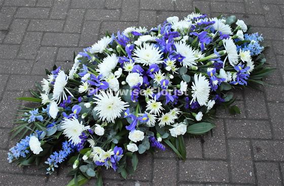 This beautiful Blue and White Casket Spray is designed to be placed on top of the coffin. The Coffin Oasis Spray consists of Blue Delphiniums or Larkspur, White Blooms, White Delianne Chrysanths, White Carnations, White Spray Carnations, Blue Statice and complimented with Choice Foliages.