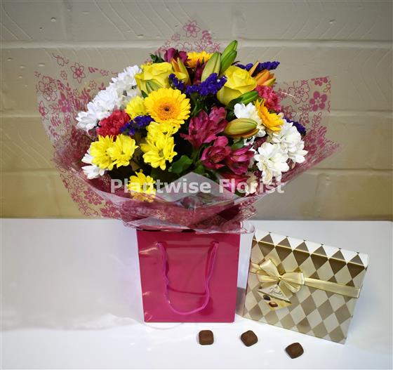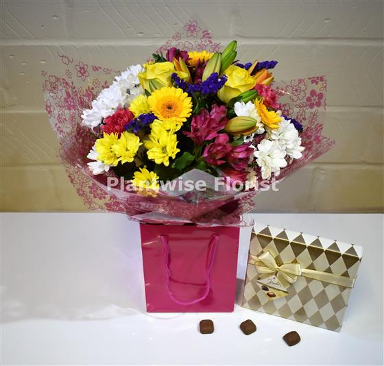 Plantwise Florist will deliver a large box chocolates and a lovely hand-tied bouquet of flowers which is perfect to buy for a birthday, mothers day, thank you or get well gift.