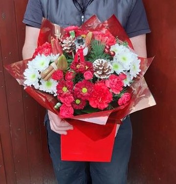 Please note These Christmas Flowers are hand made by Plantwise Florist in Canvey Island so can be ordered for Christmas flower delivery in SS8 Canvey Island, SS7 Benfleet, South Benfleet, Thundersley, New Thundersley, Daws Heath, Hadleigh, SS13 Pitsea or Bowers Gifford in Essex or can be collected in store free of charge on any day you wish before Christmas. All deliveries are done by our own drivers at Plantwise Florist . It is essential you include a phone number for the delivery address we are delivering to in case someone does not answer the door. We DO NOT Call before we get to the address we only call if we have no answer at the delivery address.