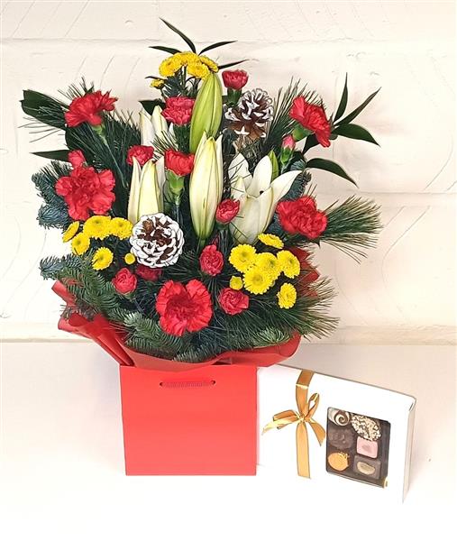Plantwise Florist Christmas Gift Set includes our Seasonal Christmas Fresh Flowers arranged into a Christmas gift box with a box of delicious Chocolates included in price.