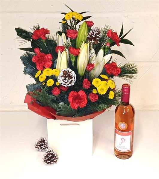 Our Christmas Gift Set includes our Frosty Morning Gift Box filled with seasonal Christmas Fresh Flowers with a bottle of our finest Rose, Red and White Wine included in price.