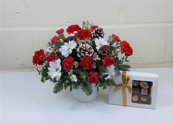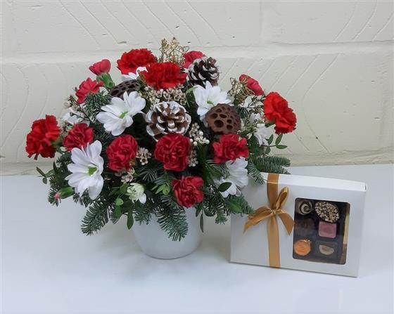 A Really special Festive Christmas flower arrangement with a box of delicious Chocolates included in the price makes this Christmas present really special and a florist favourite.