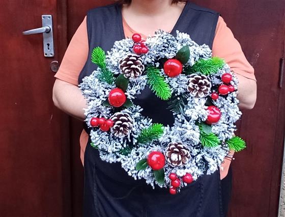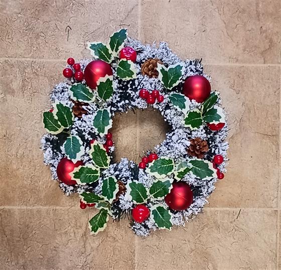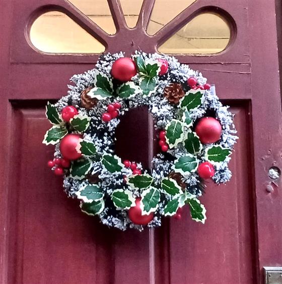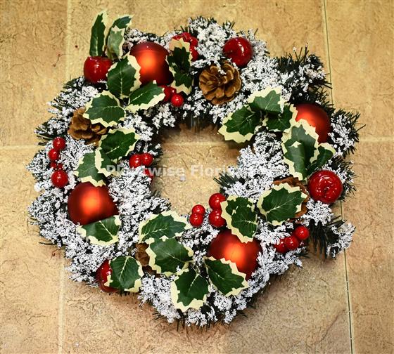 Plantwise Florist sell Artificial Christmas Wreaths. This beautiful Christmas Wreath is made of thick Spruce covered in Snow decorated with Red Apples, Christmas Baubles, Variegated Silk Holly, Red Berries and Natural Pine cones.