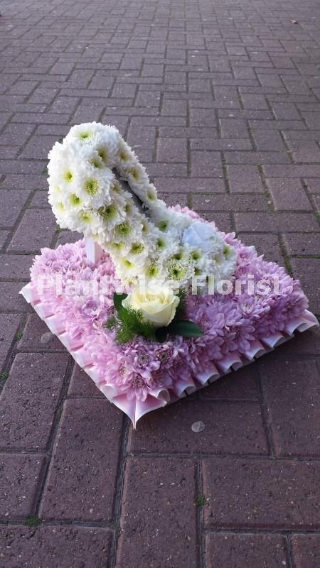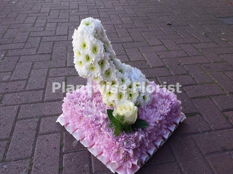 Essex girls are known for wearing their white stiletto shoes so Plantwise florist have created this White Stiletto Shoe all in flowers as a funeral tribute wreath to send to a ladies funeral. We have made this White Stiletto Shoe as a 3D design as this gives a lot more detail and makes this white shoe tribute wreath really stand out.