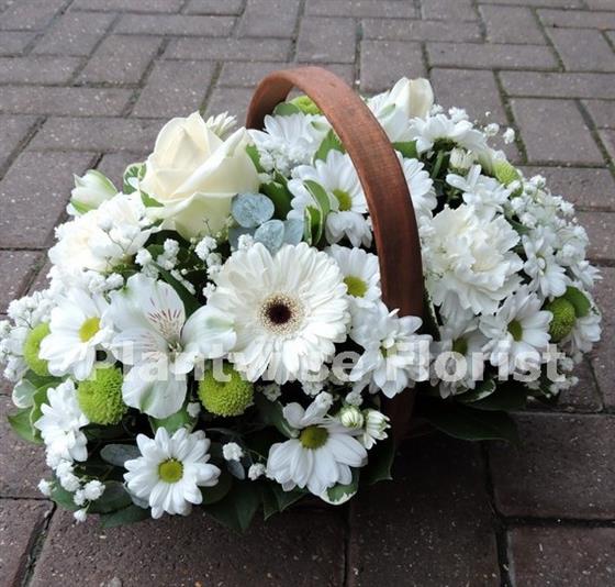 We will carefully arrange delicate white Germini, Roses, Alstromeria, Gypsophilia, Chrysanthemums, Carnations and mixed greenery into a wooden trug basket to create our eternal peace basket which can be ordered for a funeral.