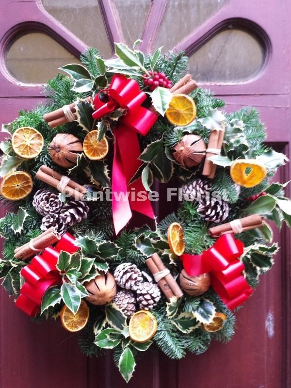Plantwise Florists have hand-made this Luxury Fresh Christmas Wreath for your door using luxury thick blue spruce Christmas pine with mixed Christmas greenery, whole oranges, dried fruit slices, pine cones, cinnamon bundles and finished with rich red ribbon, making it full of Christmas spirit and would make a lovely Christmas present to send or a treat for yourself to hang at home. Can also placed at the graveside if required.