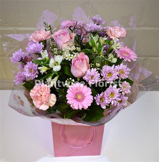 This is one of our best selling Mother's Day Bouquets and features the most popular Mother's day flowers in shades of pretty pinks and soft whites, expertly hand-tied and finished with pretty pink gift wrapping, aqua packed and delivered in water placed in a pretty pink gift bag and sent with your love.