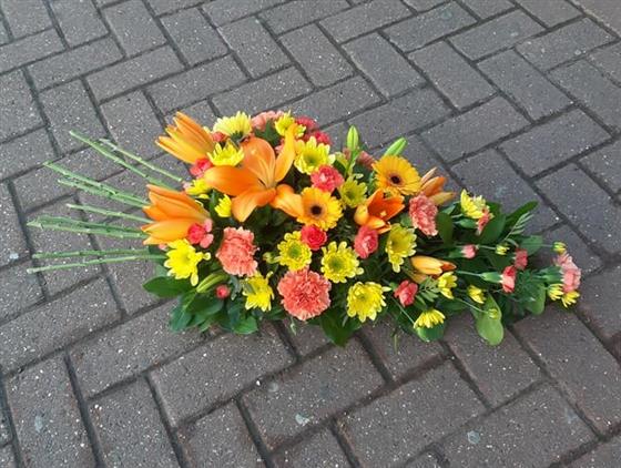 This orange and yellow funeral Oasis Spray is for locally delivery in Canvey Island SS8, Benfleet SS7, Thundersley SS7, Hadleigh SS7 & Pitsea Basildon SS13 or collected in-store. Some other local delivery areas also available call 01268 514557 for details.