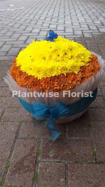 This Giant Yellow Cupcake funeral flower wreath can be delivered to SS8 Canvey Island, SS7 Benfleet, Hadleigh, Thundersley, SS13 Pitsea Basildon or can be collected in-store. Some other delivery areas also available call 01268 514557 for details.