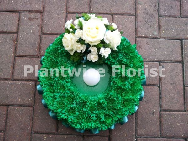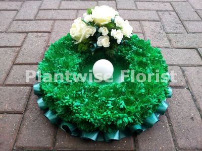 Our Specially designed golf hole in one wreath has all been made in flowers with a cluster of white Roses & Spray Carnations arranged onto the side of the wreath.