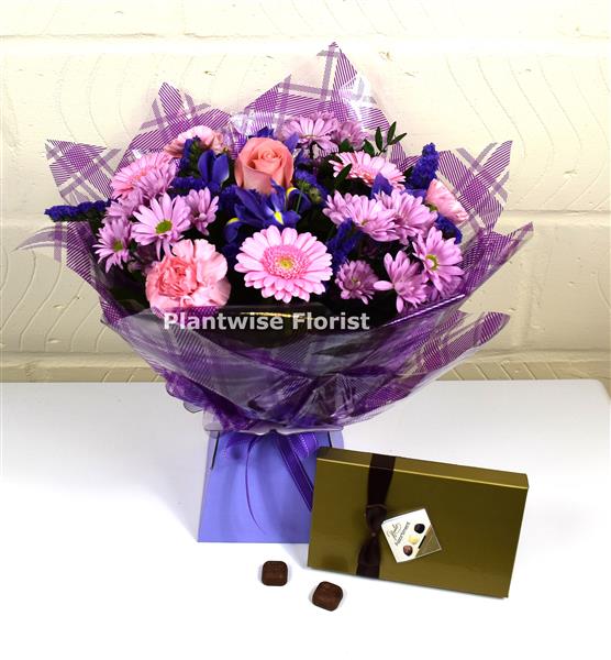 Our Pink and Purple Valentine Bouquet of Flowers with Chocolates Gift Set can be delivered on Valentines Day to Canvey Island SS8, Benfleet SS7, Thundersley SS7, Hadleigh SS7, Pitsea SS13 or Click & Collect in-store at Plantwise Florists in Canvey Island.