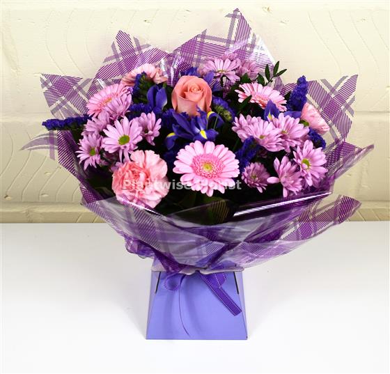 Send our pretty pink and purple Valentine's bouquet of flowers for the one you love, hand-tied in water with purple gift wrapping and delivered in lilac gift box ready for them to enjoy.