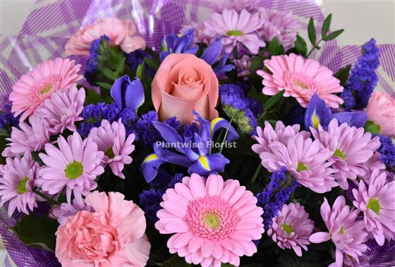 Plantwise Florists Hugs and kisses Valentine bouquet of Purple and Pink Flowers can be delivered on 14th February Valentine's Day flowers delivery in Canvey Island and surrounding areas.