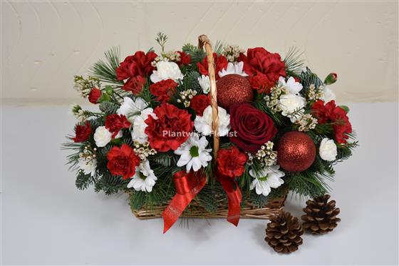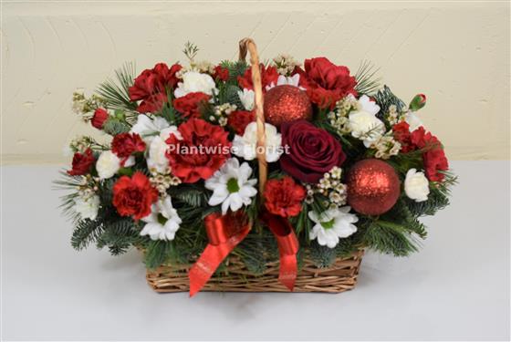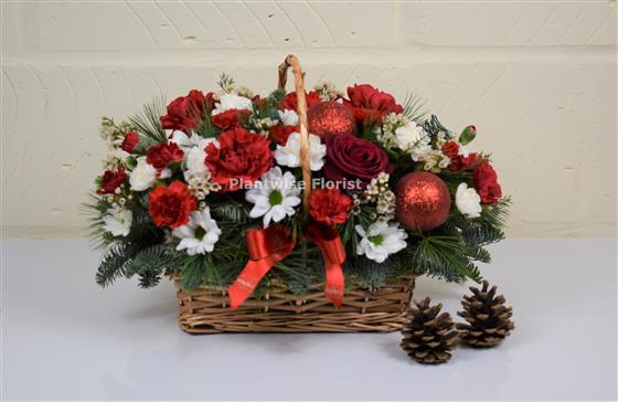 A Firm Favourite to buy is our festive Christmas basket of flowers. Created in a traditional wicker basket arranged with stunning red rose, red & white spray carnations, white chrysanthemum, dainty wax flowers, red carnations and Christmas Cones with Christmas blue spruce and seasonal Christmas greenery, finished with a festive red ribbon bow.