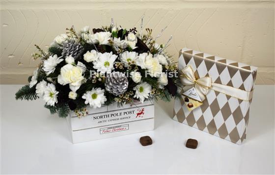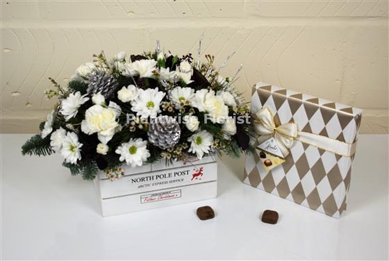 Plantwise Florist have skillfully arranged spray carnations, chrysanthemum, wax flowers, carnations, lotus seed heads, silver pine cones, silver birch with Christmas blue spruce and seasonal winter greenery arranged into white wooden basket and the Chocolates make this gift extra special. (Please note decoration on basket differs very slightly from photo)